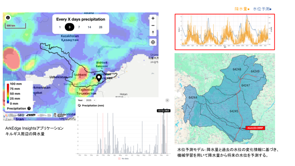 当社が開発・提供する衛星画像解析のWebベースGISプラットフォーム「ArkEdge Insights®」を活用し、キルギス国内の流域特性や過去の水文状況を解析します。衛星データと地上観測データを組み合わせることで、洪水予測モデル構築に必要な解析環境を整備します。
